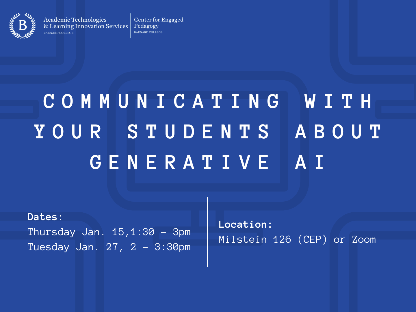 The CEP and ATLIS are hosting a faculty workshop on strategies for communicating about generative AI with your students. A participant from our 2023 workshop described this as “the session that [they’ve] found most useful and applicable to [their] own teaching setting.”